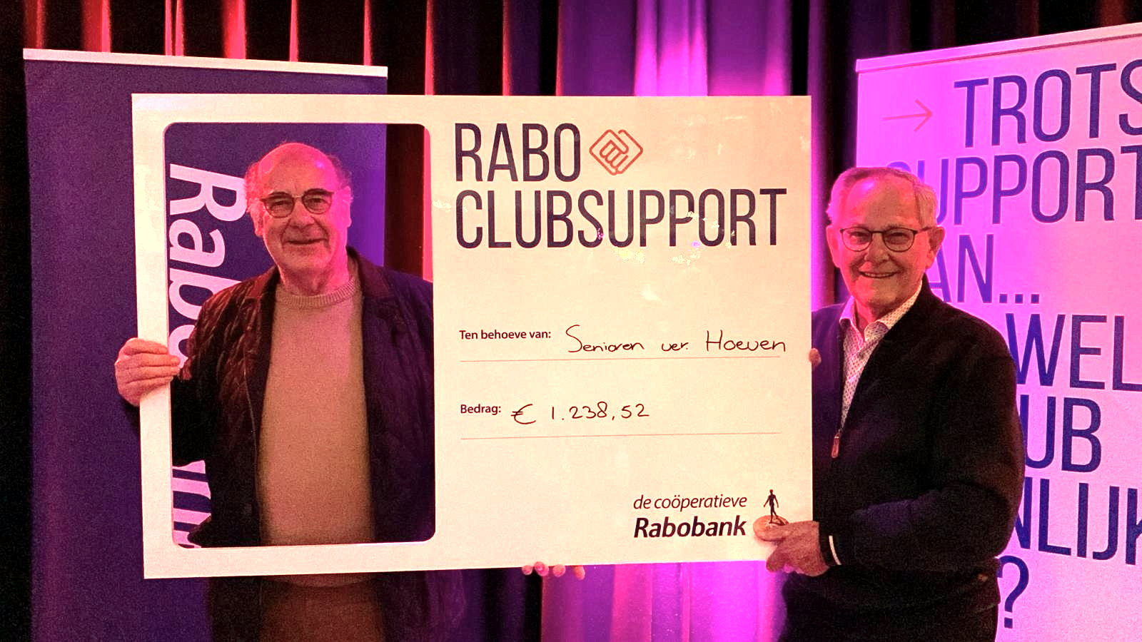 Hartelijk dank aan al onze stemmers tijdens de Rabo Clubsupport. Woensdagavond 8 oktober is bekend geworden dat we €1238,52 mochten ontvangen voor onze Senioren Vereniging Hoeven. Nogmaals dank namens het bestuur.